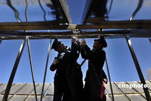 2009年春,一套由800塊太陽能集熱板組成的“營房聚光太陽能采暖系統(tǒng)” 落戶西藏日喀則空軍某場(chǎng)站。這套系統(tǒng)每天能供暖8至10個(gè)小時(shí),節(jié)電4800度左右。中新社發(fā) 郭超英 攝