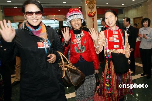 3月1日下午,參加全國政協(xié)十一屆二次會議的全國政協(xié)委員開始陸續(xù)抵京。圖為來自云南的少數(shù)民族委員在駐地受到工作人員的熱烈歡迎。中新社發(fā) 傅丹丹 攝