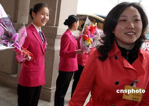 3月2日下午,出席十一屆全國(guó)人大二次會(huì)議的上海代表團(tuán)抵達(dá)北京,“打工妹代表”朱雪芹表示,面對(duì)金融海嘯沖擊,她最關(guān)心農(nóng)民工就業(yè)問題。中新社發(fā) 任晨鳴 攝