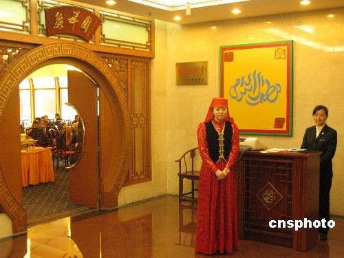 3月2日,在全國政協(xié)委員入駐的北京友誼賓館,服務(wù)員穿起民族服裝,迎接參加會議的委員到伊斯蘭餐廳用餐。中新社發(fā) 張子揚 攝