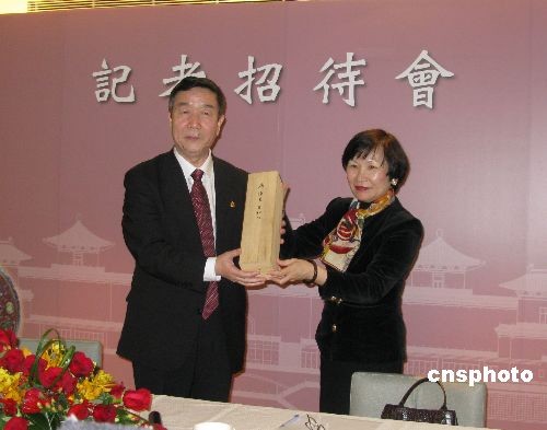 3月2日下午,臺(tái)北故宮博物院與北京故宮博物院代表在臺(tái)北故宮博物院,就2月15日雙方在北京達(dá)成的共識(shí)舉行進(jìn)一步會(huì)談,并在會(huì)后召開記者會(huì),發(fā)表落實(shí)合作交流方案,雙方同意在不涉及名稱載示及法令之前提下,進(jìn)行8項(xiàng)實(shí)質(zhì)性合作。根據(jù)落實(shí)方案,今年故宮兩院將舉辦首屆學(xué)術(shù)研討會(huì)并每年于7月至9月互訪、互贈(zèng)新出版品,互派人員駐訪2至3個(gè)月,協(xié)商互設(shè)商品柜臺(tái),臺(tái)北故宮今年舉辦的雍正特展向北京故宮借展27組(37件)文物等。圖為臺(tái)北故宮博物院院長周功鑫(右)向北京故宮博物院院長鄭欣淼(左)贈(zèng)送唐代懷素《自敘帖》的高仿真復(fù)制品。中新社發(fā) 路梅 攝