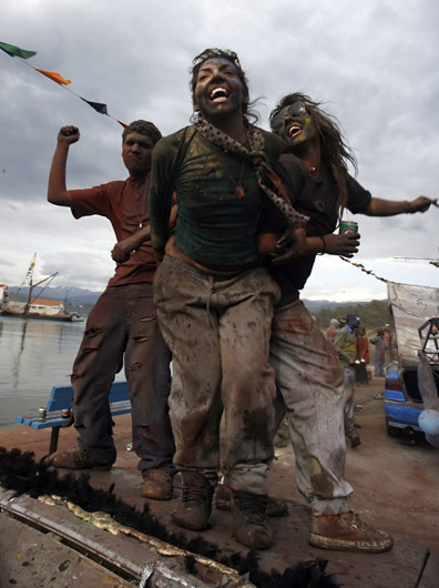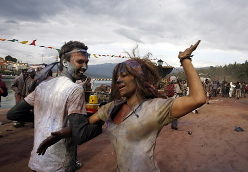 3月2日,人們在希臘雅典西北小城加拉希迪的街道上用加了各種天然顏料的面粉互相投撒,表達(dá)祝福。