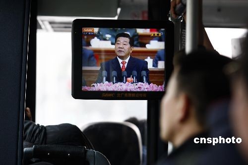 3月3日,全國政協(xié)十一屆二次會(huì)議在北京人民大會(huì)堂開幕,北京市民在公交車上通過移動(dòng)電視收看相關(guān)報(bào)道。中新社發(fā) 鄭雄增 攝