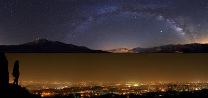 “夜空下的世界”項目的另外一重要目標,就是提醒人類注意城市燈光污染。現(xiàn)在城市明亮的燈光已讓人們很難看到夜空中的星星。本圖上半部分的弧形,其實就是伊朗北部上空的銀河,而下半部分則是燈光污染的德黑蘭。耀眼的燈光在照亮世界的同時也帶來了燈光污染,太亮的燈光可能導致居民無法安睡、司機駕車炫目等。對天文學家和天文愛好者來說,眾多的強亮光還嚴重影響他們觀測星空。世界多個國家已經(jīng)開始與燈光污染作斗爭,比如在一些新開發(fā)的地區(qū),要求安裝不正對空中的燈光裝置,鼓勵夜晚照明燈光全部射向地面。