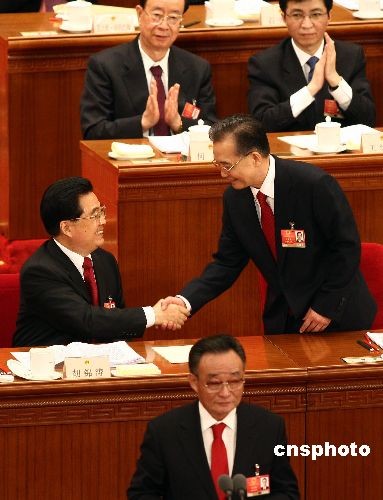 3月5日上午,十一屆全國(guó)人大二次會(huì)議在北京人民大會(huì)堂開幕,國(guó)務(wù)院總理溫家寶作《政府工作報(bào)告》后,與國(guó)家主席胡錦濤握手。中新社發(fā) 杜洋 攝