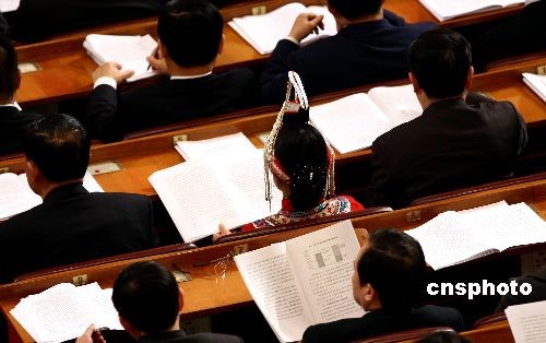 3月5日上午,十一屆全國人大二次會議在北京人民大會堂開幕,國務院總理溫家寶作《政府工作報告》,參會代表邊聽邊認真閱讀報告文本。中新社發(fā) 杜洋 攝