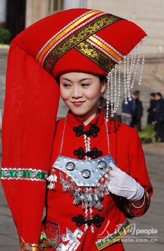 3月5日上午,是十一屆全國人大二次會(huì)議在人民大會(huì)堂內(nèi)開幕的時(shí)間,會(huì)場內(nèi)代表委員們?yōu)闇乜偫砭实恼ぷ鲌?bào)告鼓掌喝彩,會(huì)場外人民大會(huì)堂東側(cè)門口的廣場上也因這些姑娘們的出現(xiàn)而光彩靚麗。她們是此次大會(huì)的壯族禮儀姑娘們,她們有著與60年共和國的旗幟一樣的色彩——中國紅!