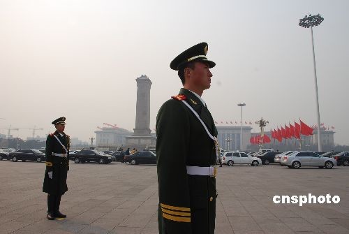 3月5日上午,全國人大十一屆二次會議在北京開幕,國內(nèi)外3000記者云集京城,值勤武警在天安門廣場站崗值勤,吸引了眾多媒體的鏡頭。中新社發(fā) 韓海冰 攝