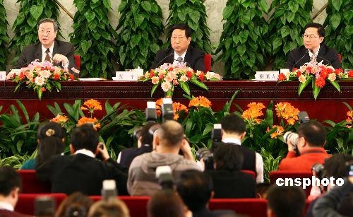 3月6日,十一屆全國人大二次會議在北京人民大會堂舉行記者會,國家發(fā)展和改革委員會主任張平、財政部部長謝旭人、中國人民銀行行長周小川就應(yīng)對國際金融危機、保持經(jīng)濟平穩(wěn)較快發(fā)展問題答記者問。中新社發(fā) 杜洋 攝