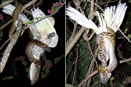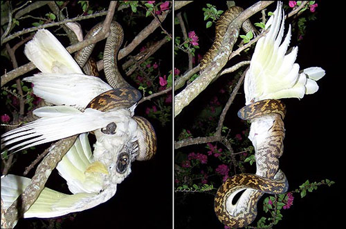 蟒蛇吞食鸚鵡。英國一名女子拍攝到了一條蟒蛇吞吃一只美冠鸚鵡的全過程。事情發(fā)生在英國凱恩斯克利夫頓海灘一戶人家的院子內,當時一條蟒蛇纏繞在一顆大樹的樹枝上,忽然間它發(fā)現(xiàn)了美味的獵物——一只美冠鸚鵡。這條蟒蛇緩慢地爬過去,猛地撲向鸚鵡,將鸚鵡死死纏住,直到鸚鵡窒息后,慢慢地將其吞下去。