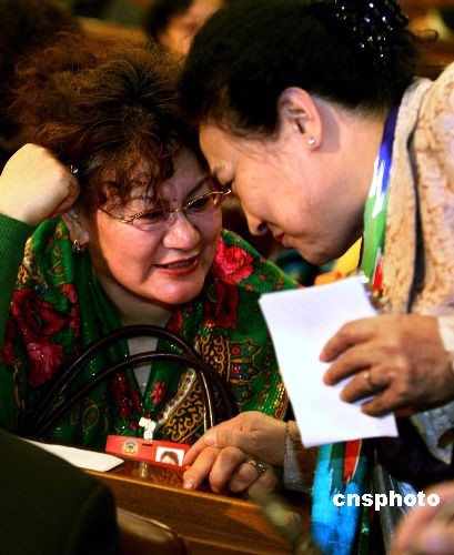 3月7日下午,全國(guó)政協(xié)十一屆二次會(huì)議舉行第二次全體會(huì)議,提前到會(huì)的兩位少數(shù)民族委員說(shuō)起“私房話”。中新社發(fā) 宋吉河 攝