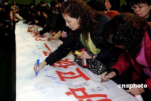 三月八日國(guó)際婦女節(jié),由廣東省婦聯(lián)主辦的“凈化網(wǎng)絡(luò)護(hù)衛(wèi)孩子--萬名母親網(wǎng)絡(luò)護(hù)衛(wèi)行動(dòng)”啟動(dòng)儀式,在廣州華南師范大學(xué)附屬中學(xué)舉行。圖為母親和孩子紛紛簽名支持該項(xiàng)活動(dòng)。中新社發(fā) 劉衛(wèi)勇 攝