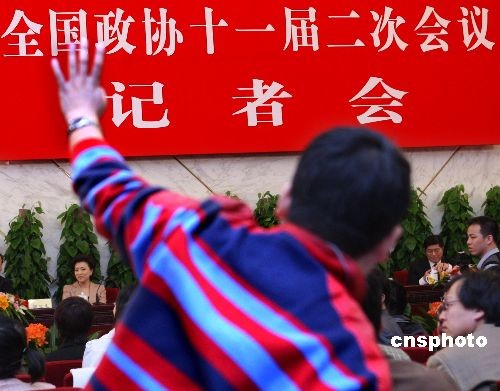 全國政協(xié)十一屆二次會議3月8日就2010年5月上海舉辦世界博覽會舉行記者會,香港大公報記者踴躍提問。萬季飛、周漢民、成岳沖、楊瀾等四位全國政協(xié)委員回答了籌備中的上海世界博覽會資金來源,籌備進度情況,外界關注的美國、臺灣參展情況,金融危機的影響及民營企業(yè)參展情況等問題。與會中外記者表現(xiàn)出極大關注,爭相提問。中新社發(fā) 宋吉河 攝