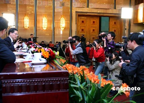 在全國政協(xié)十一屆二次會議3月8日就2010年5月上海舉辦世界博覽會舉行記者會,萬季飛、周漢民、成岳沖、楊瀾等四位全國政協(xié)委員回答記者提問。他們回答了籌備中的上海世界博覽會資金來源,籌備進度情況,外界關注的美國、臺灣參展情況,金融危機的影響及民營企業(yè)參展情況等問題。與會中外記者表現(xiàn)出極大關注,爭相提問。中新社發(fā) 宋吉河 攝