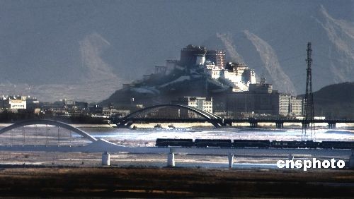 3月9日,青藏鐵路上的列車駛過拉薩城西側(cè)的拉薩河大橋。據(jù)悉,有關(guān)方面爭(zhēng)取今年“五一”前開行青藏鐵路五星級(jí)豪華列車。目前,已經(jīng)有不少旅行社聯(lián)系青藏鐵路五星級(jí)列車,客源情況很好。中新社發(fā) 廖攀 攝