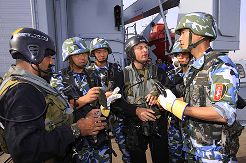 中國海軍特戰(zhàn)隊員(中)參加“和平—09”多國海上聯(lián)合軍演時與巴基斯坦海軍特戰(zhàn)隊員交流。