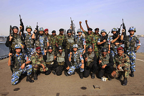 中國海軍特戰(zhàn)隊員、巴基斯坦海軍特戰(zhàn)隊員和尼日利亞海軍特戰(zhàn)隊員在海上直升機(jī)滑降演習(xí)現(xiàn)場合影。查春明 攝