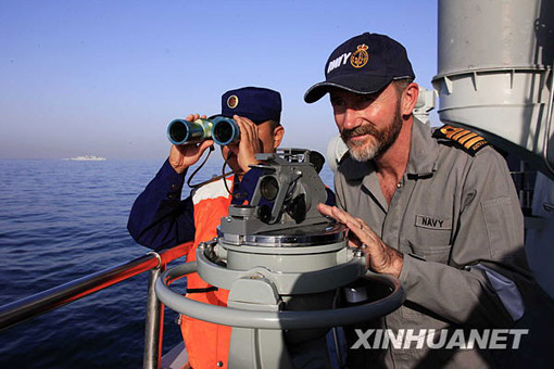 3月9日,在巴基斯坦南部卡拉奇港附近的阿拉伯海舉行的“和平-09”海上多國(guó)聯(lián)合軍事演習(xí)實(shí)兵演練中,澳大利亞海軍觀察員(右)在中國(guó)海軍“廣州”號(hào)驅(qū)逐艦上觀摩演習(xí)。查春明 攝
