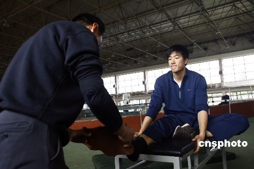 3月10日上午, 劉翔在上海莘莊基地開始進(jìn)行正式訓(xùn)練,在訓(xùn)練間隙,孫海平教練用一塊海綿來幫助訓(xùn)練劉翔右腳的靈敏性。孫海平教練表示:由于劉翔的傷勢(shì)剛剛恢復(fù),右腳踝關(guān)節(jié)力量還不夠,用海綿訓(xùn)練是為了增加劉翔右腳踝的靈活性。”中新社發(fā) 湯彥俊 攝