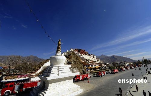 3月10日,西藏公安消防特種裝備車輛駛過布達拉宮廣場。當(dāng)日,西藏公安消防特種裝備車輛服役儀式在拉薩市舉行,26輛消防車輛在市區(qū)主要街道進行拉動演練。中新社發(fā) 廖攀 攝