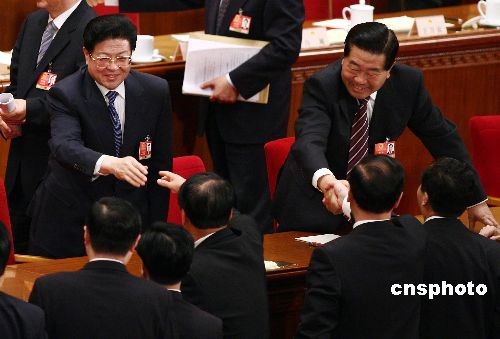 3月10日,全國(guó)政協(xié)主席賈慶林、全國(guó)人大常委會(huì)副委員長(zhǎng)王兆國(guó)在十一屆全國(guó)人大二次會(huì)議第三次全體大會(huì)結(jié)束后和代表握手。中新社發(fā) 杜洋 攝