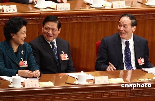 3月10日,第十一屆全國(guó)人民代表大會(huì)第二次會(huì)議在人民大會(huì)堂舉行第三次全體會(huì)議,最高人民法院院長(zhǎng)王勝俊、最高人民檢察院檢察長(zhǎng)曹建明分別作工作報(bào)告。國(guó)務(wù)院副總理王岐山(右)、北京市委書記劉淇(中)、國(guó)務(wù)委員劉延?xùn)|在主席臺(tái)上交談。中新社發(fā) 杜洋 攝