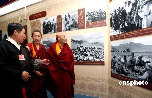 3月11日,參加全國政協(xié)會議的宗教界委員參觀在北京民族宮舉辦的西藏民主改革50年大型展覽。中新社發(fā) 傅丹丹 攝