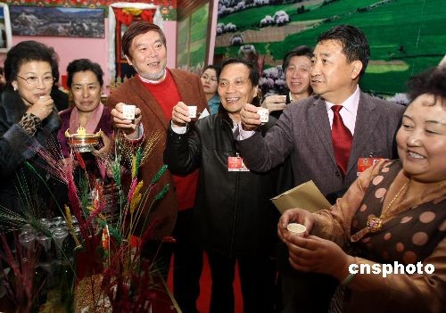 3月11日,參加全國政協(xié)會(huì)議的文藝界委員參觀在北京民族宮舉辦的西藏民主改革50年大型展覽。圖為委員們?cè)谖鞑孛窬语L(fēng)格的布景館里共飲酥油茶。中新社發(fā) 傅丹丹 攝
