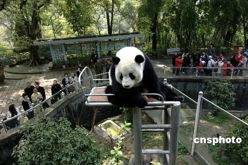 三月十二日,臺灣游客正在福州熊貓世界觀看熊貓。大熊貓“團團”、“圓圓”在臺灣產(chǎn)生的效應(yīng),致使現(xiàn)在來福州觀看熊貓的臺灣游客比以前增加三倍以上。中新社發(fā) 王東明 攝