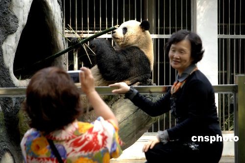 三月十二日,臺(tái)灣游客在福州熊貓世界與熊貓近距離合影留念。大熊貓“團(tuán)團(tuán)”、“圓圓”在臺(tái)灣產(chǎn)生的效應(yīng),致使現(xiàn)在來(lái)福州觀看熊貓的臺(tái)灣游客比以前增加三倍以上。中新社發(fā) 王東明 攝