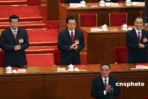 3月13日,第十一屆全國(guó)人民代表大會(huì)第二次會(huì)議在北京人民大會(huì)堂舉行閉幕會(huì),表決通過(guò)各項(xiàng)決議。胡錦濤、吳邦國(guó)、溫家寶、賈慶林出席大會(huì)。中新社發(fā) 盛佳鵬 攝