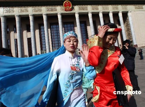3月13日,第十一屆全國人民代表大會第二次會議在人民大會堂閉幕,少數(shù)民族代表在盎然的春風中步出人民大會堂。中新社發(fā) 杜洋 攝