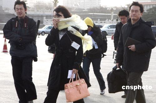 3月13日,初春的北京刮起凜冽的寒風(fēng),采訪第十一屆全國人民代表大會第二次會議閉幕會的記者們冒著狂風(fēng)艱難地穿過天安門廣場,進(jìn)入人民大會堂采訪。中新社發(fā) 任晨鳴 攝