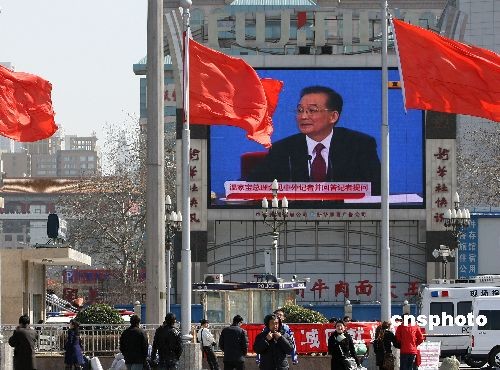 2009年3月13日,國務(wù)院總理溫家寶在人民大會堂與采訪全國兩會的中外記者見面,北京站站前大屏幕對此進(jìn)行實(shí)況轉(zhuǎn)播,吸引往來旅客的關(guān)注。中新社發(fā) 魯谷 攝