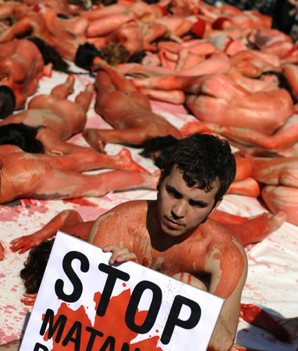 3月15日,西班牙馬德里,動(dòng)物保護(hù)協(xié)會(huì)成員身涂人造血,抗議捕獵海豹。