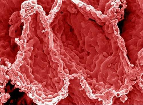 肺氣泡:這張彩色圖片顯示的是人類肺部內(nèi)表面。圖中的洞穴是肺氣泡,這里是血液交換氣體的地方。