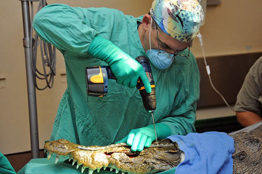 據(jù)英國媒體3月18日報道,美國佛羅里達動物園一只受傷的大鱷魚,經(jīng)過手術,頭部被41枚釘子以及4塊鐵板固定,現(xiàn)在被人戲稱為“機器鱷魚”。這只長達10英尺的鱷魚是在一起車禍事故中受傷的。經(jīng)醫(yī)生介紹,現(xiàn)在鱷魚的恢復情況良好。