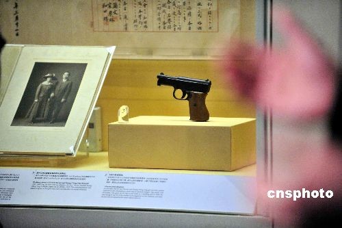 圖為毛瑟手槍(復(fù)制品),是孫中山于一九一五年送給宋慶齡的結(jié)婚禮物;及孫中山和宋慶齡結(jié)婚照(復(fù)制品)。中新社發(fā) 譚達明 攝