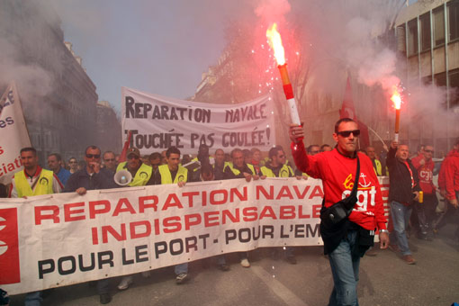 3月19日法國各大工會在全國各地聯(lián)合組織罷工和示威游行等活動,抗議薩科齊政府在應(yīng)對當(dāng)前經(jīng)濟危機過程中忽視勞動者權(quán)益和社會福利。圖為法國城市馬賽舉行罷工游行。