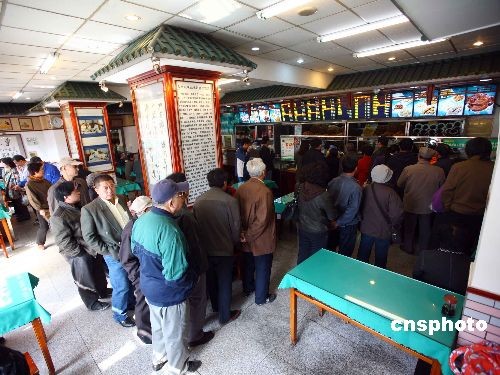 3月20日,迎來(lái)24節(jié)氣中的“春分”,意思是說(shuō)春天過(guò)了一半。按照老北京的習(xí)俗,“春分吃豆面糕(驢打滾),避邪祈福”。北京著名護(hù)國(guó)寺小吃連鎖店為這天的到來(lái)準(zhǔn)備了1萬(wàn)多個(gè)驢打滾。圖為在護(hù)國(guó)寺小吃店了排隊(duì)買(mǎi)驢打滾的民眾。中新社發(fā) 富田 攝