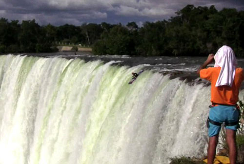 中新網(wǎng)3月24日電 據(jù)英國媒體23日報道,一位名叫佩德羅-奧麗維亞的巴西小伙,日前乘坐皮劃艇從落差達(dá)38.7米(127英尺)的賽爾托-貝洛(Salto Belo)瀑布“俯沖”了下來。整個墜落過程歷時2.95秒,在最后時刻,奧麗維亞的頭部以每小時70英里的速度撞向翻騰的水面。但他不僅大難不死,而且還如愿以償?shù)拇蚱屏嗽瓉?08英尺的“墜瀑布”世界紀(jì)錄。