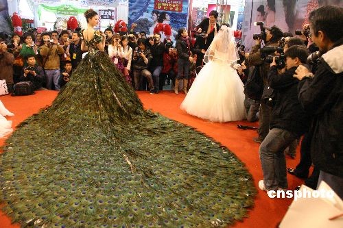 2009年3月28日,為期三天的“中國(guó)2009南京首屆婚慶文化博覽會(huì)暨長(zhǎng)三角婚慶高端品牌嘉年華”在南京國(guó)際展覽中心開幕,在婚博會(huì)上亮相的一件價(jià)值999.9萬元的“玉羽云”讓參觀者大飽眼福。據(jù)悉,這件“玉羽云”由78歲的蘇繡大師顧文霞設(shè)計(jì),用2009片天然孔雀羽毛、南京云錦、蘇繡制作而成,并以60粒和田玉作為配飾,由8位工作人員利用40天時(shí)間創(chuàng)作而成。