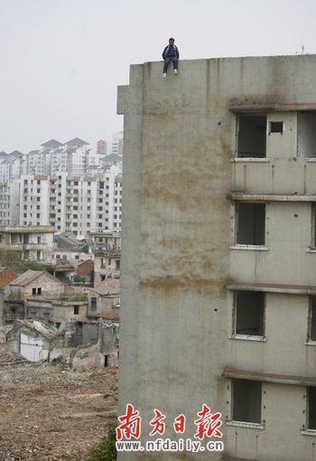 3月31日,一名來(lái)自山西太原的男子先后兩次爬上廣東佛山市禪城人民路旁的一棟9層待遷居民樓樓頂,重復(fù)著驚險(xiǎn)的“跳樓”情景。當(dāng)日下午2時(shí)30左右,該男子坐在該棟樓樓頂邊沿,拒絕警察提供的幫助,結(jié)果不小心滑落,身體懸空,幸好隨手抓了樓頂邊緣,被警察及時(shí)救起。不過(guò)讓人意外的是,當(dāng)日18:30,該男子又坐在同一棟樓樓頂邊緣,最終在警察及消防人員的勸說(shuō)下離開。據(jù)公安局相關(guān)人士介紹,該男子姓劉,年紀(jì)不到20歲,自稱因工作壓力、家庭矛盾而“想不開”。目前,該男子已被警察帶至人民路附近派出所“做思想工作”,避免類似事情再次發(fā)生。張由瓊 攝