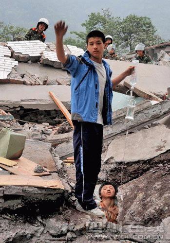 2008年5月13日上午9時許,早報攝影記者在北川中學廢墟旁,拍到一張照片。照片上,“夾縫男孩”廖波仍在夾縫里,舉著點滴瓶的人,卻不是李陽。海洋看過那張照片后,我們才知道,“吊瓶兄弟”不止一個。