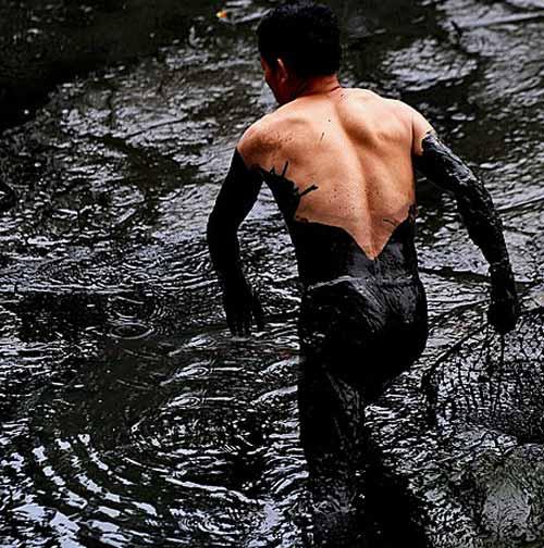 據(jù)華農(nóng)某施工隊(duì)的鄭師傅說,學(xué)校為了迎接校慶,計(jì)劃縮小池塘面積,并重新規(guī)劃周邊區(qū)域。約一周前就開始不分晝夜抽水,至昨日滿塘水被抽到塘底。昨日中午就開始有人下水捉魚,大頭魚、鯉魚、鯰魚……品種很多,每條最少五六斤,幾個小時內(nèi)已撈起近千斤魚。昨日下午3時許,曾有校衛(wèi)過來驅(qū)趕捕魚者。但校衛(wèi)一走,眾人又一窩蜂下水,之后再無人來干涉。