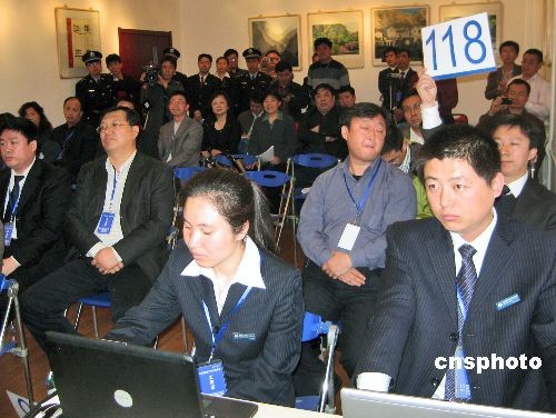 4月9日,河北省嘉海拍賣有限公司作為主拍單位,與河北省東方拍賣有限公司、河北省拍賣總行有限公司共同對(duì)三鹿集團(tuán)部分破產(chǎn)資產(chǎn)進(jìn)行拍賣。面對(duì)拍賣的三鹿集團(tuán)(山東)乳業(yè)有限公司95%股權(quán),四家公司輪番叫價(jià)毫不放松,競(jìng)爭(zhēng)激烈。北京三元集團(tuán)最終以4900萬人民幣競(jìng)買成功。圖為北京三元集團(tuán)舉牌(118號(hào))叫價(jià)。中新社發(fā) 翟羽佳 攝