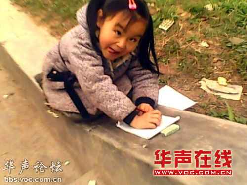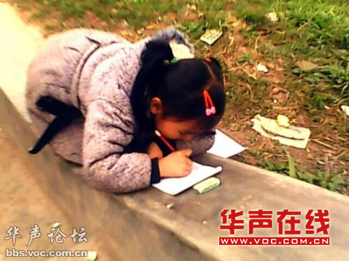 “盡管是初春,但若有若無(wú)的雨絲,也讓人忍不住要裹緊衣服。女孩一直在專心地做著作業(yè),并沒(méi)有因?yàn)樘葑由厦嬗腥俗呦聛?lái)而受到影響!卑l(fā)帖人稱自己在一個(gè)小區(qū)工地發(fā)現(xiàn)這名小女孩并和她攀談起來(lái):“我問(wèn)她為什么不回家,偏偏跑到有雨的外面做作業(yè)?她調(diào)皮地朝我做了一個(gè)鬼動(dòng)作,‘我媽媽叫我在這里做作業(yè)!