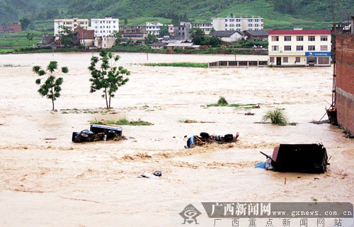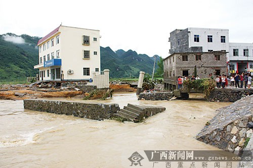 6月9日凌晨3時(shí)許,與貴州交界的環(huán)江毛南族自治縣馴樂(lè)苗族鄉(xiāng)遭受嚴(yán)重洪澇災(zāi)害,洪水淹沒(méi)大片田地,卷走多輛停放在馴樂(lè)街的汽車,馴樂(lè)河大橋坍塌,一名老年男子隨著被洪水卷走的房屋而失蹤。