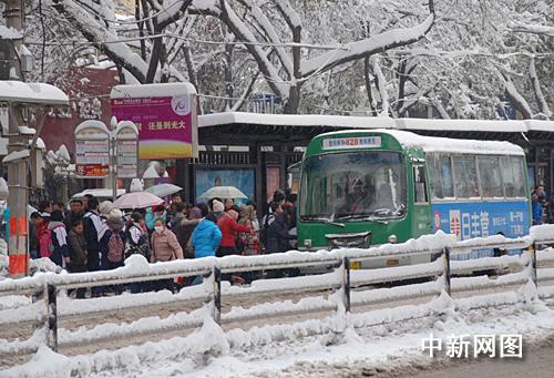 11日下午,在山西太原市街頭,一片銀裝素裹。街頭兩旁一些樹枝被大雪壓斷,受暴雪的影響街道上行駛的車輛明顯減少,一些環(huán)衛(wèi)工人正在緊急清掃路面上的積雪,居民出行只能選擇步行或乘坐公交汽車。攝影:張雷杰