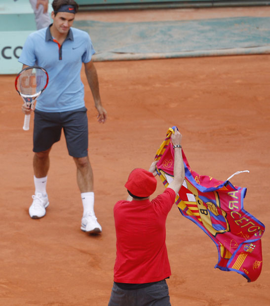 法網(wǎng)男單決賽場上,一位費(fèi)天王的癡心球迷沖入球場,強(qiáng)行將自制的一頂帽子戴到費(fèi)德勒的頭上。安保人員及時(shí)出現(xiàn),將狂熱粉絲架出場外。